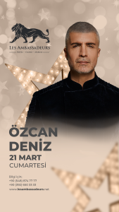 Türk müziğinin sevilen ismi Özcan Deniz, güçlü sesi, romantik şarkıları ve sahnedeki etkileyici performansıyla Ramazan Bayramı’nın 2. günü, 21 Mart 2026 Cumartesi akşamı Les Ambassadeurs Hotel & Casino sahnesinde müzikseverlerle buluşuyor.