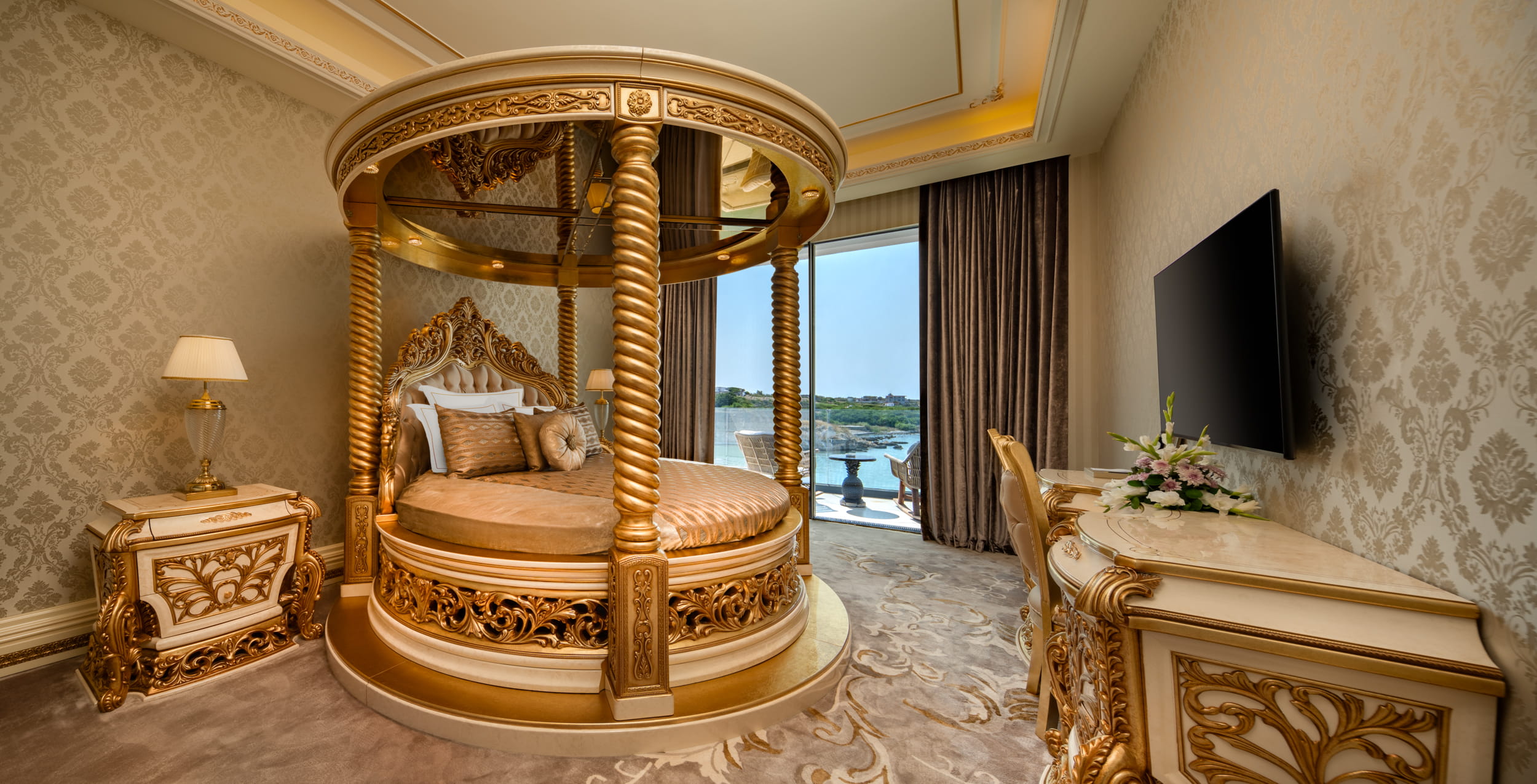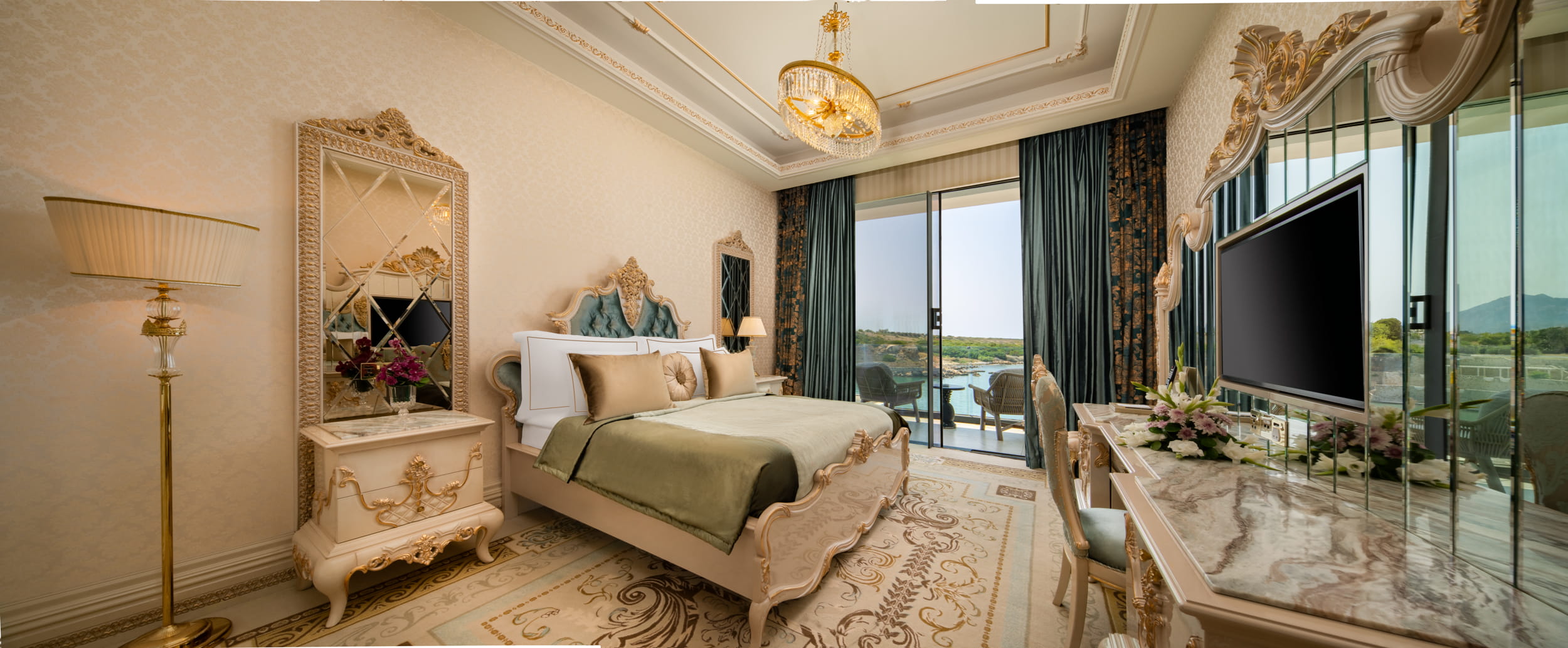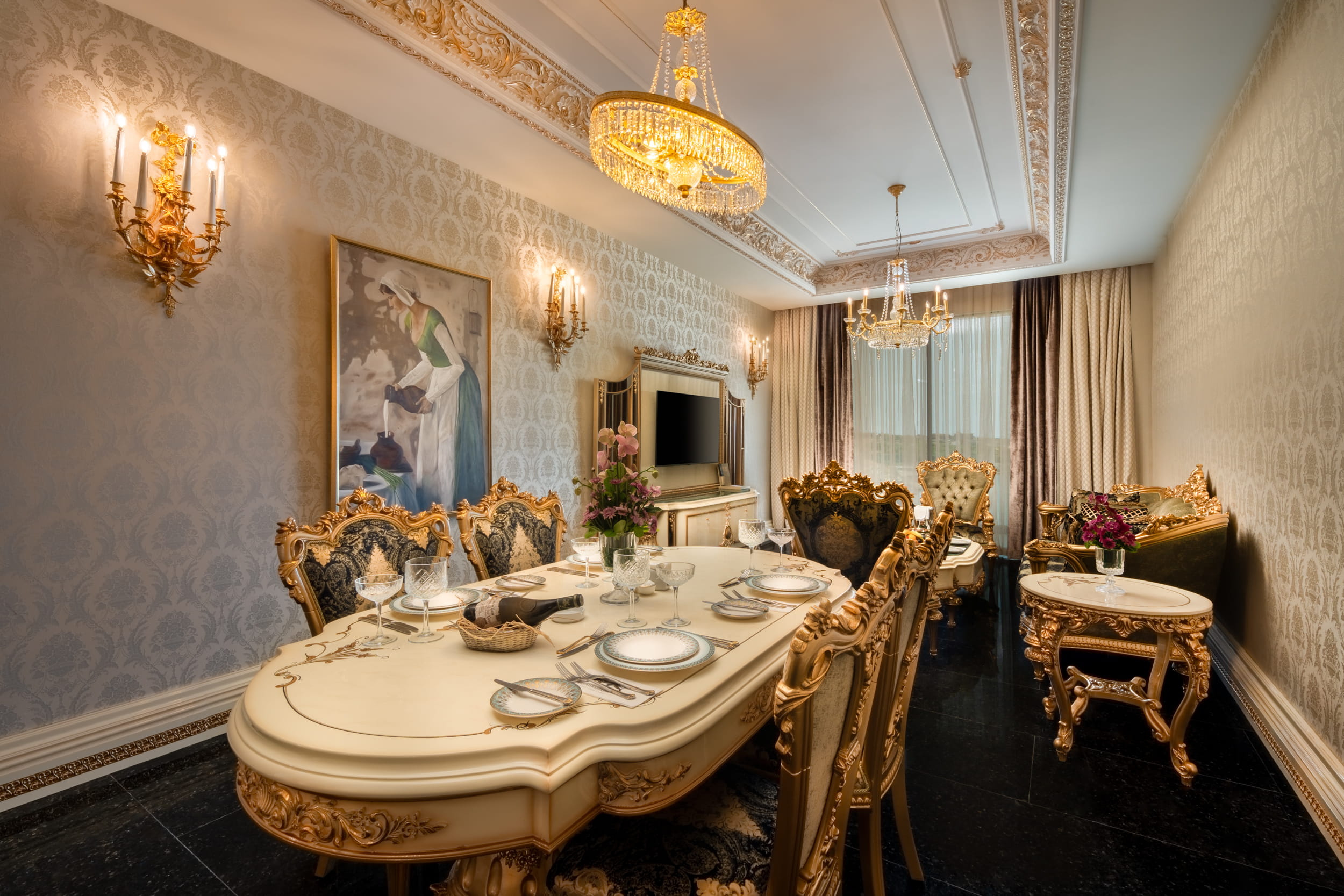 Royal Suites, nefes kesen altın rengi ve zarif iç tasarımı ile gerçek bir göz ziyafeti sunar. 220 m²’lik alanı ile İtalyan ve Fransız dokunuşlarıyla açık plan konforu sağlar ve oturma odası, yemek odası, ebeveyn yatak odası ile misafir yatak odası sunmaktadır.